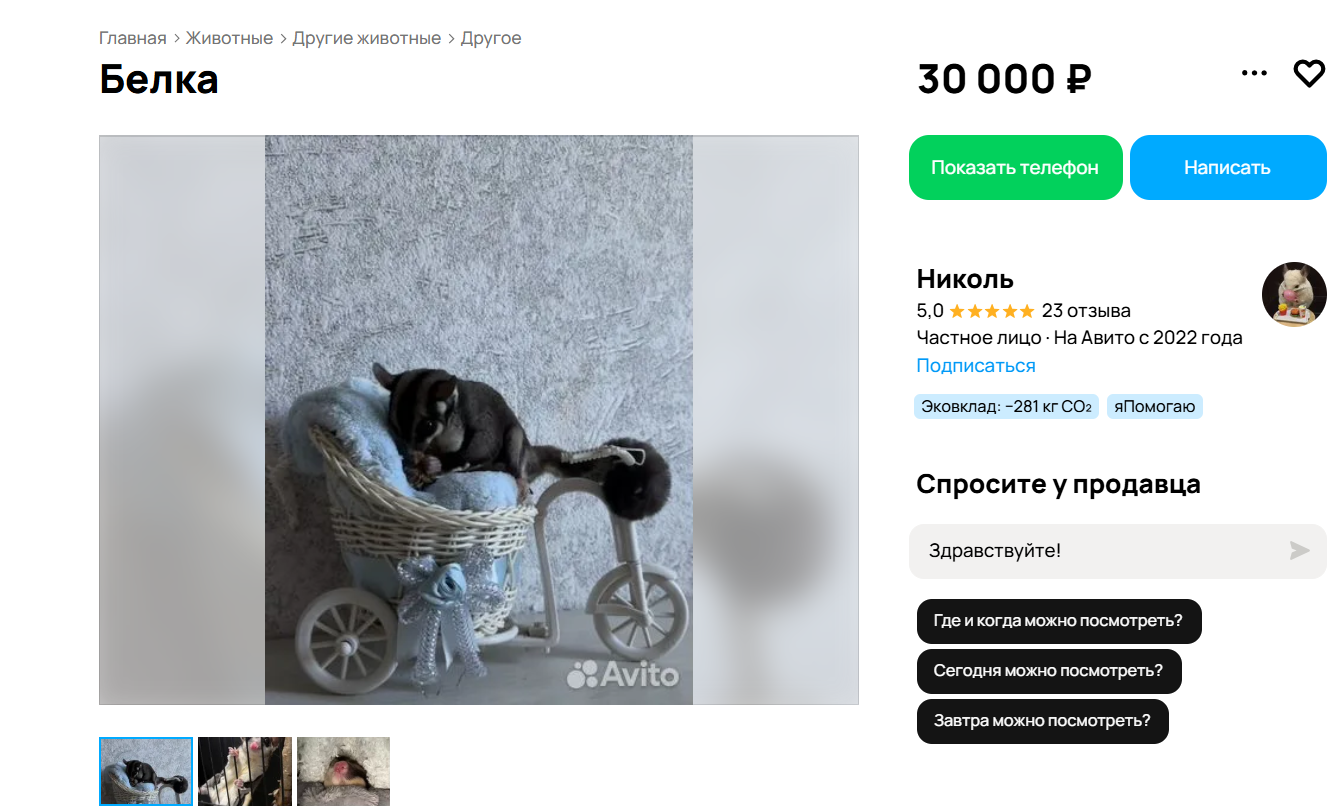 Так, в Барнауле за 30 тысяч рублей предлагают пару ручных и активных белок-летяг, которые, по заверению продавца, хорошо адаптируются к жизни в квартире. Отдельно подчёркивается, что зверьков продают только вместе из-за их сильной привязанности друг к другу. Вместе с животными новый владелец получит комплект аксессуаров: колесо для бега, поилку, миски, гамаки и домики. Покупателю предоставят полную информацию по питанию и содержанию, возможна отправка в другие регионы за его счёт.