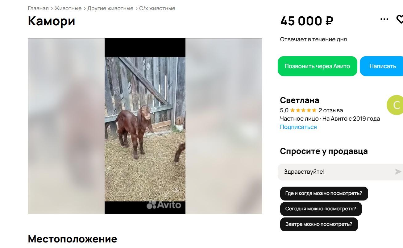 К числу экзотических предложений относится и восточная коза породы камори с длинными ушами, её стоимость составляет 45 тысяч рублей. Также доступны для покупки полуторамесячные козлики по цене 15 тысяч рублей за особь.