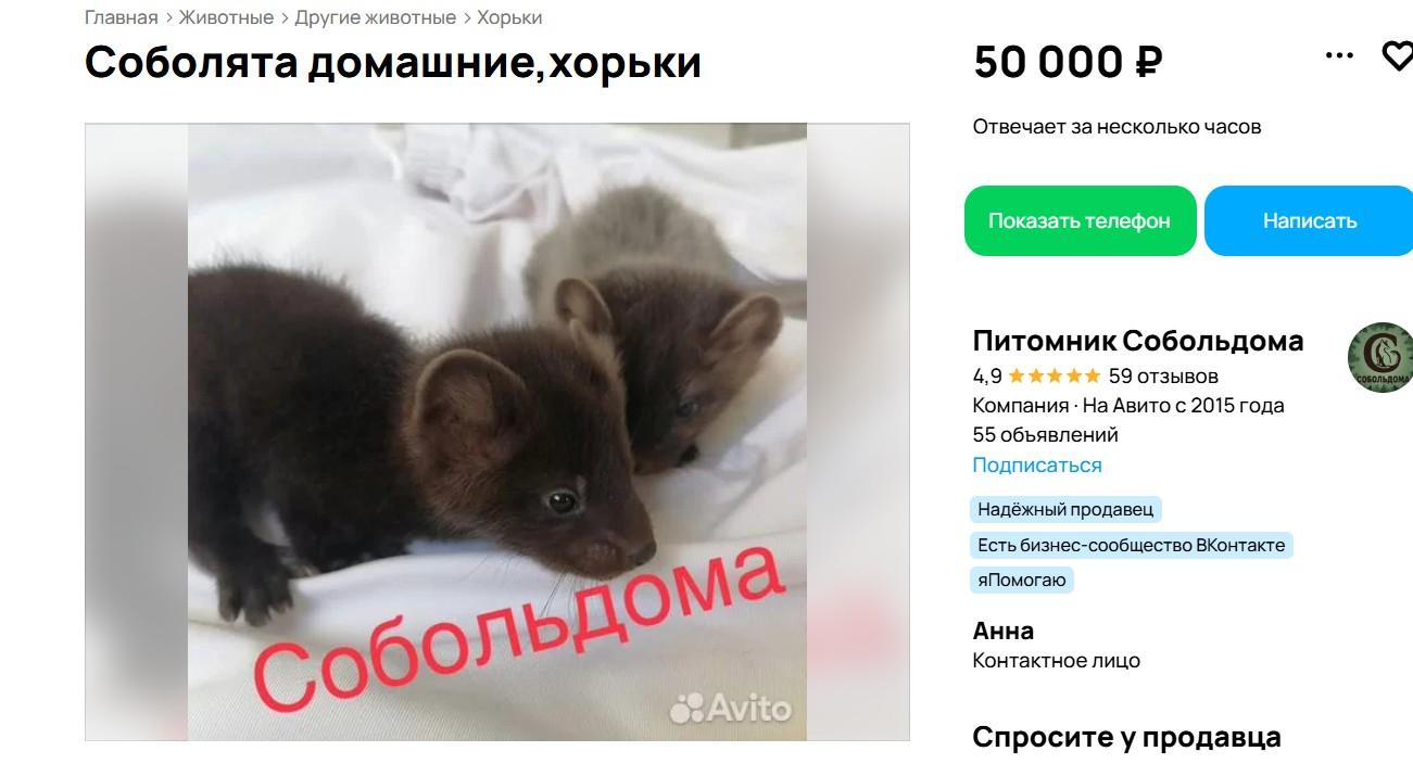 Ценителям редкой фауны продавцы предлагают соболей или хорьков за 50 тысяч рублей, акцентируя внимание на их природной красоте и уникальности — такой питомец, по их словам, привнесёт в дом частичку дикого леса. Оптимальным для переезда к новому хозяину считается возраст соболят от 40 до 55 дней, поскольку более молодые особи ещё слишком слабы. Продавцы гарантируют здоровье животного и оказывают консультационную поддержку после сделки.