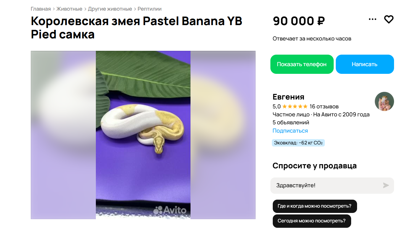 Любителей рептилий в Барнауле могут заинтересовать живородящий геккон, рождённый в сентябре 2025 года, за 130 тысяч рублей, а также королевская змея стоимостью 90 тысяч рублей.