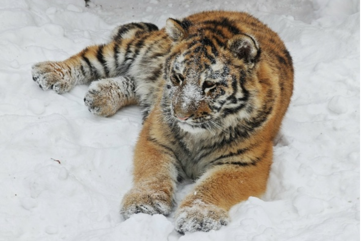 Молодая тигрица по кличке Ракша наслаждается зимней погодой, играя в снегу на территории зоопарка «Лесная сказка».