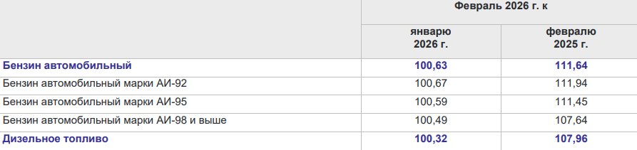 В феврале динамика роста заметно замедлилась: цена бензина выросла на 0,6%, а дизельного топлива — лишь на 0,3%. Средняя стоимость литра АИ-92 достигла 59,93 рубля, АИ-95 — 63,13 рубля. Дизельное топливо стало самым дорогим, его цена составила 85,52 рубля за литр.