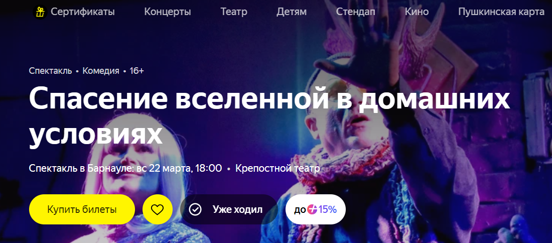 Театральная афиша включает три спектакля. Крепостной театр 21 марта в 18:00 покажет комедию «Три плюс кот» (16+) о мужчине и его говорящем коте. Билеты — 1300 рублей. 22 марта в 18:00 тот же театр представит спектакль «Спасение вселенной в домашних условиях» (16+) с рисунками ребёнка в качестве персонажей. Цена аналогичная. Молодёжный театр Алтая имени Золотухина 22 марта в 17:00 приглашает на драму «Марьино поле» (12+) о женщинах, ждущих мужей с войны. Билеты стоят 400 рублей.