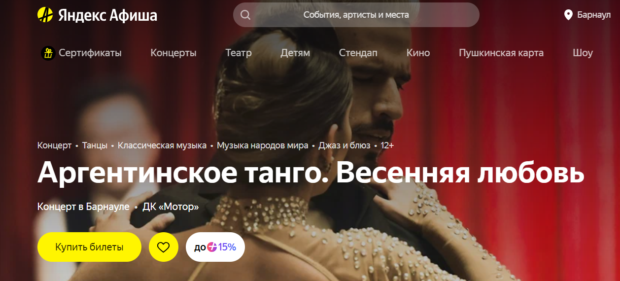 В тот же день в 19:00 во Дворце культуры «Мотор» состоится программа «Аргентинское танго. Весенняя любовь». Проект «Золотые годы танго» объединяет танго и джаз, представляя зрителям кинематографическую хореографию и живую музыку. Стоимость билетов — от 1000 до 3500 рублей. Рекомендуется для лиц старше 12 лет.