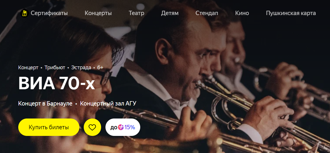 В воскресенье, 22 марта, в 17:00 в концертном зале АГУ Барнаульский духовой оркестр и ансамбль «Сиб-Мен» исполнят песни советской эстрады 1970-х годов. В программе — композиции групп «Весёлые ребята», «Песняры», «Самоцветы» и других. Цена билета — 450 рублей. Возрастной ценз — 6+.