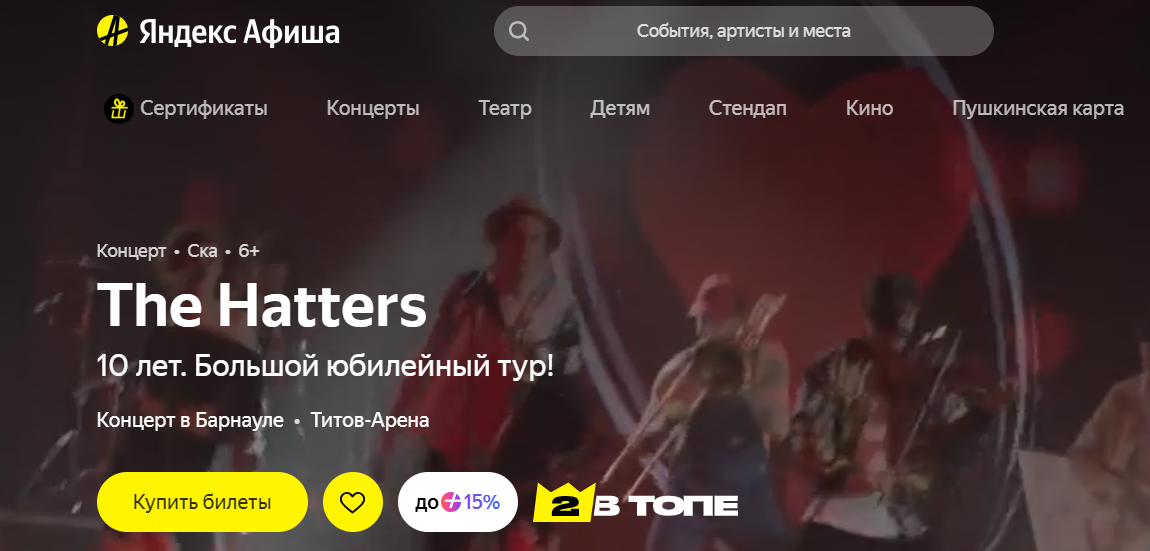 Группа The Hatters выступит 5 апреля в 20:00 на «Титов-Арене». Концерт приурочен к 10-летнему юбилею коллектива. Цена билетов варьируется от 3200 до 6500 рублей.