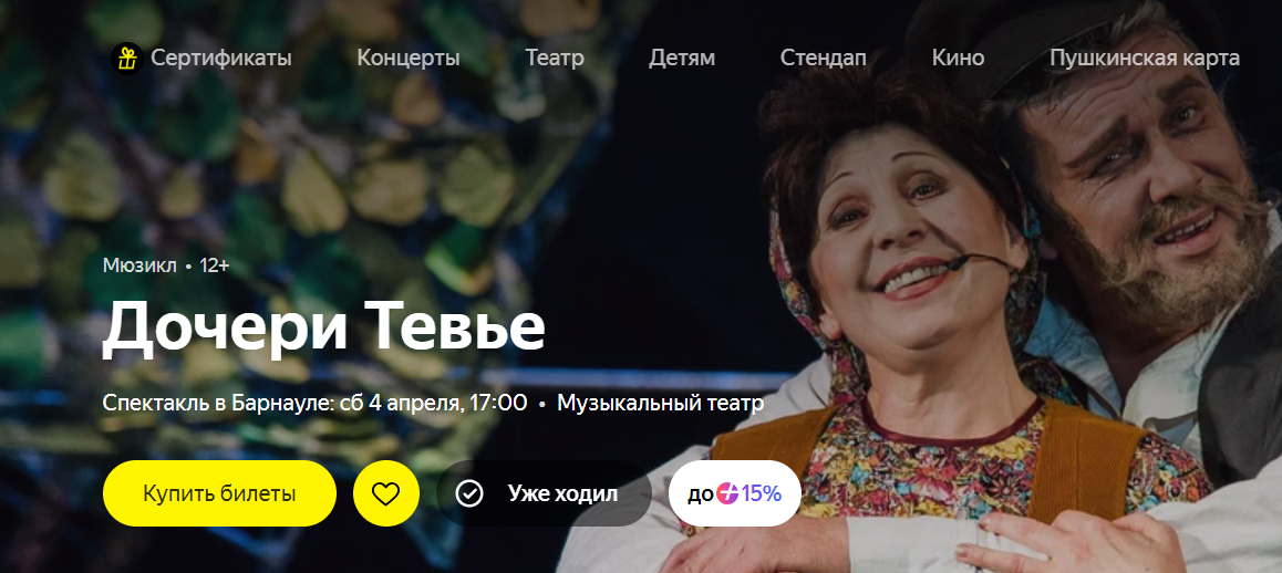 Театр Музыкальной комедии 4 апреля в 17:00 приглашает на мюзикл «Дочери Тевье», созданный по рассказам Шолом-Алейхема. Билеты можно приобрести за 300–600 рублей.