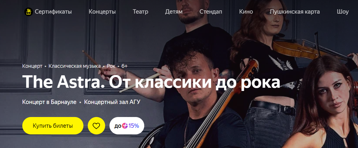 В тот же день, 5 апреля, в концертном зале АГУ в 18:00 симфонический квартет The Astra представит программу «От Классики До Рока». В исполнении на рок-виолончелях и скрипке прозвучат аранжировки произведений Чайковского и Баха, переплетенные с энергией Rammstein и Nirvana. Стоимость посещения — от 700 до 1400 рублей.