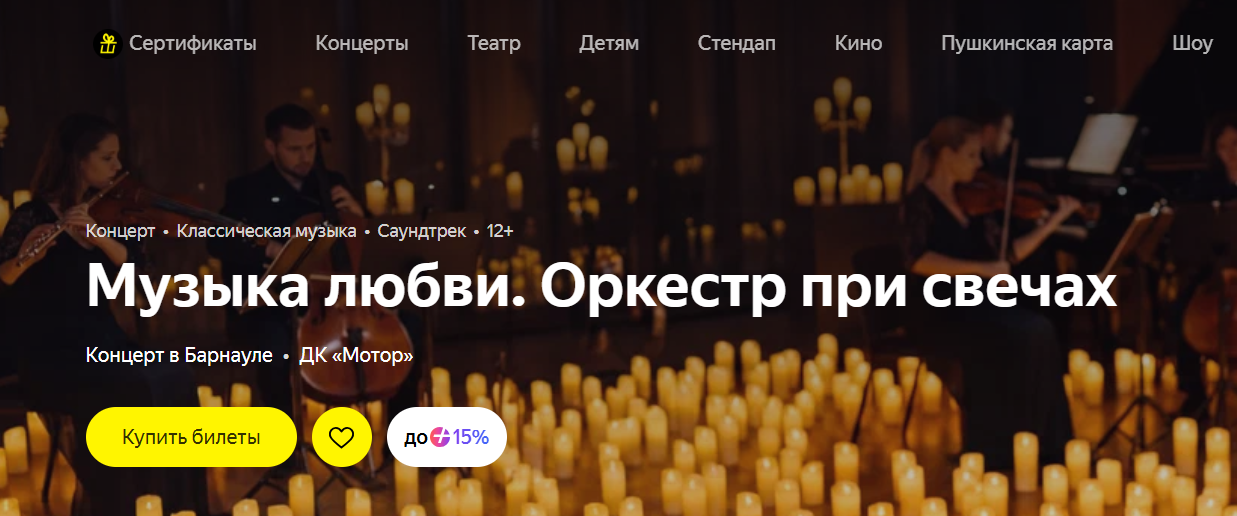 8 марта в ДК «Мотор» в 18:00 пройдет программа «Музыка любви. Оркестр при свечах» (12+). Коллектив Aura Show представит эмоциональное путешествие по оттенкам страсти: от саундтреков к «Титанику» и «Красотке» до произведений Рахманинова и хитов Adele и Lady Gaga. Цены на билеты варьируются от 1550 до 4950 рублей.