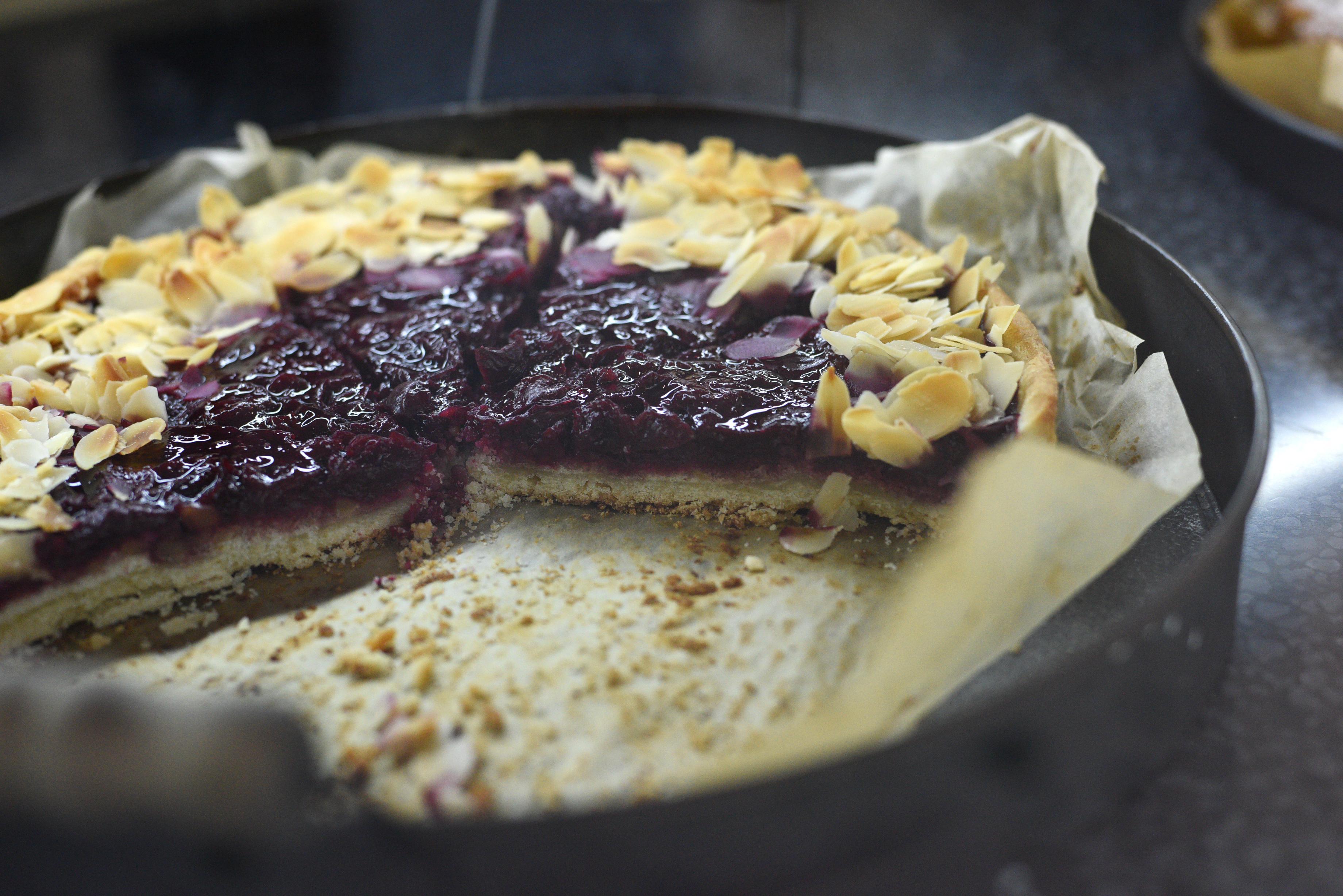 На тестовую основу выкладывают вишнёвую начинку. Из оставшейся части теста формируют полоски шириной около 2 см и выкладывают их поверх начинки в виде плетёной решётки. По желанию пирог можно посыпать миндальными лепестками.