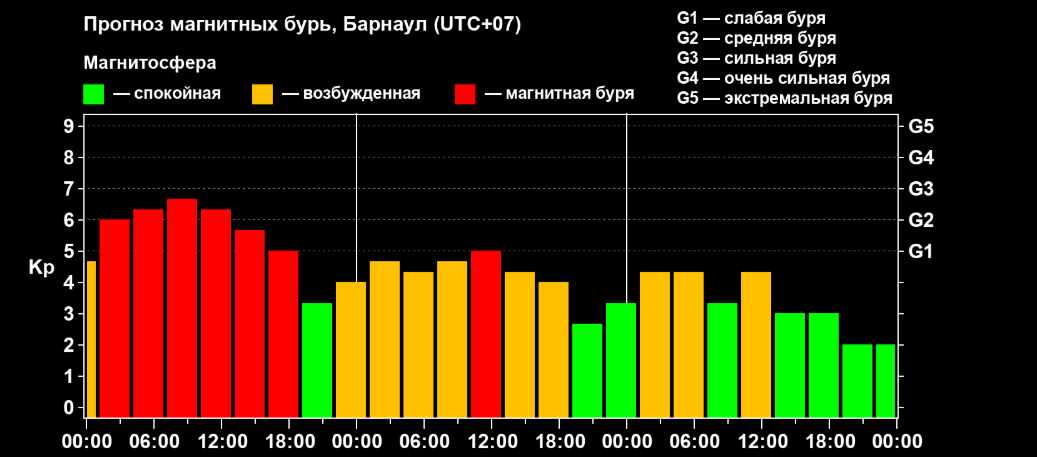 Возбуждение магнитосферы началось еще в ночные часы. Интенсивность колебаний приближается к показателю G3, что в существующей классификации соответствует средней силе бури.