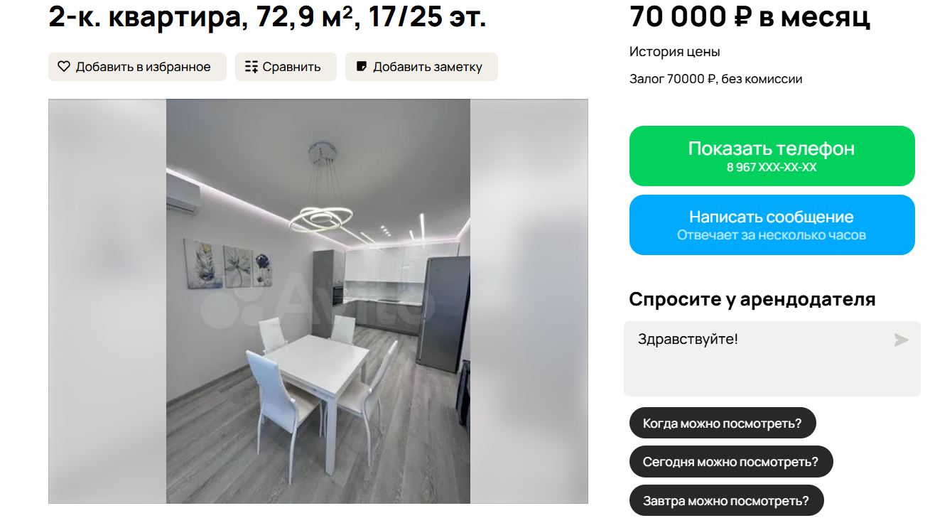 На улице Промышленная сдается трехкомнатная квартира площадью 76 кв. м на 13 этаже 25-этажного дома. Аренда стоит 80 000 рублей в месяц плюс комиссия 50%. Из окон открывается панорамный вид на город. Вся мебель и бытовая техника новые, предусмотрены системы хранения. Жильцы имеют доступ к круглосуточной подземной парковке. Залог составляет 80 000 рублей, комиссия — 40 000 рублей.