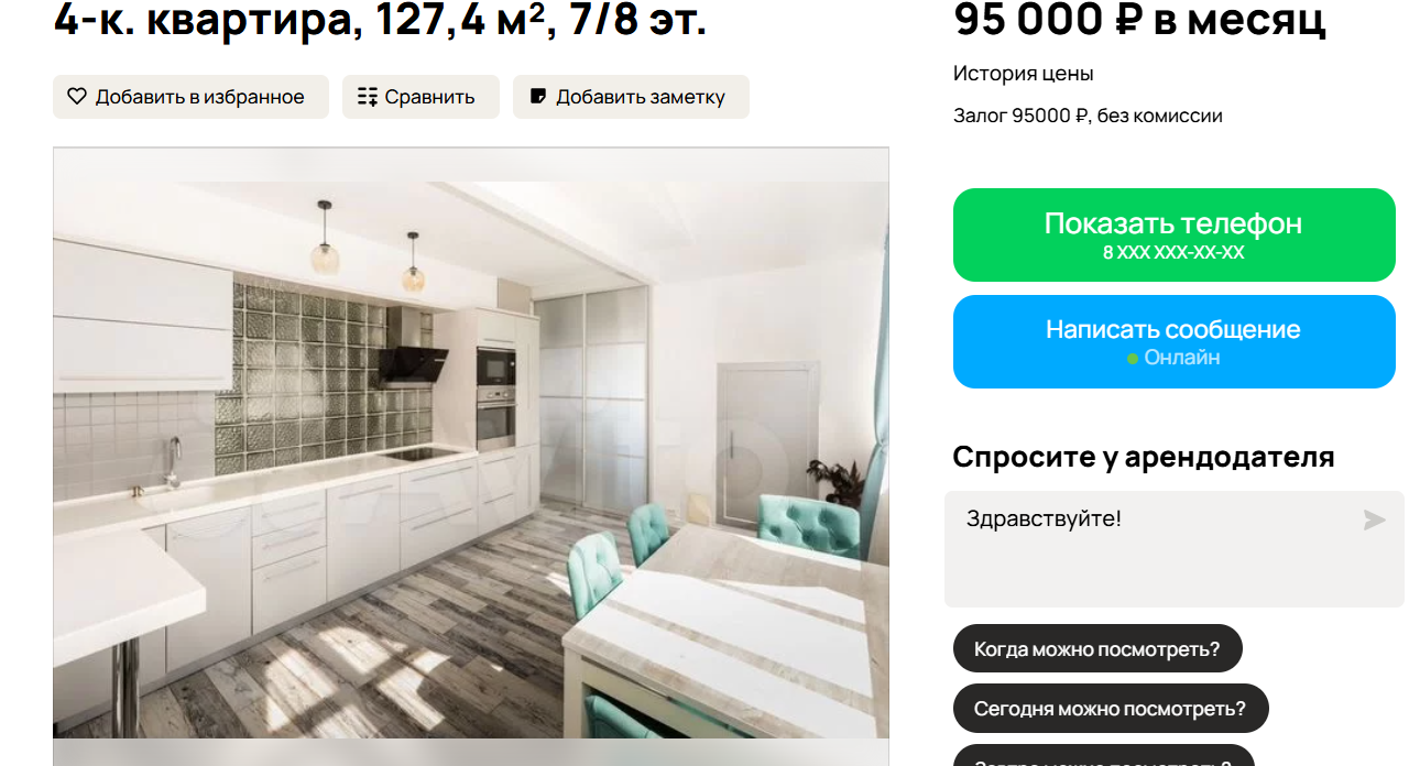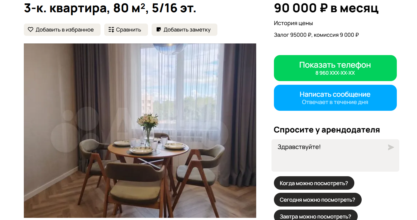 Трехкомнатная квартира в престижном жилом комплексе на Змеиногорском тракте обойдется в 90 000 рублей в месяц. Площадь составляет 80 кв. м, этаж — пятый. Условия включают комиссию 10% и залог 95 000 рублей. В жилье выполнен дизайнерский ремонт, установлена новая мебель и встроенная техника. Есть два санузла и большая лоджия. Проживание с животными запрещено. Коммунальные платежи оплачиваются отдельно и составляют около 10 000 рублей.