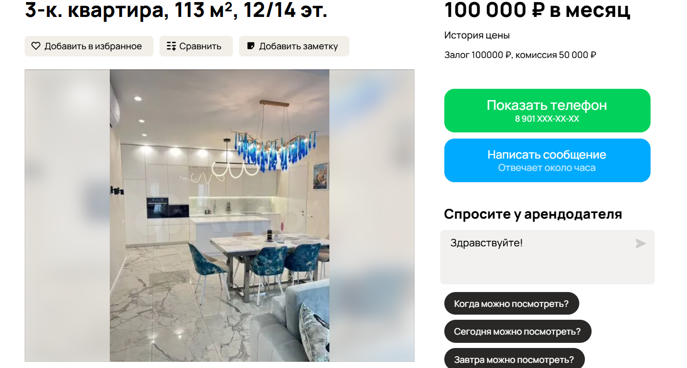 На улице Профинтерна сдается трехкомнатная квартира премиум-класса площадью 113 квадратных метров на 12 этаже. Стоимость аренды составляет 100 000 рублей в месяц. Дополнительно требуется внести залог в размере месячной платы и комиссию 50%. В апартаментах выполнен дизайнерский ремонт, есть две спальни, просторная кухня-гостиная и гардеробная. Дом имеет охраняемую территорию, наземную и подземную парковки.