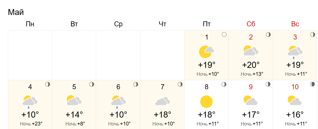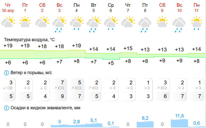 Согласно данным Gismeteo, первый месяц весны начнётся с облачной и дождливой погоды. Температура днём 1-3 мая будет достигать +18…+19 градусов, а ночью опускаться до +6. Уже 5 мая столбик термометра может упасть до +14 градусов. Осадки вероятны в период с 3 по 6 мая, а также 8, 10 и 11 числа.
