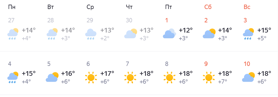Сервис «Яндекс погода» даёт более оптимистичный прогноз. Здесь дожди ожидаются только 3 и 4 мая. Воздух в начале месяца прогреется до +15 градусов, а затем постепенно потеплеет до +18. Ясная и солнечная погода установится с 6 по 9 мая.