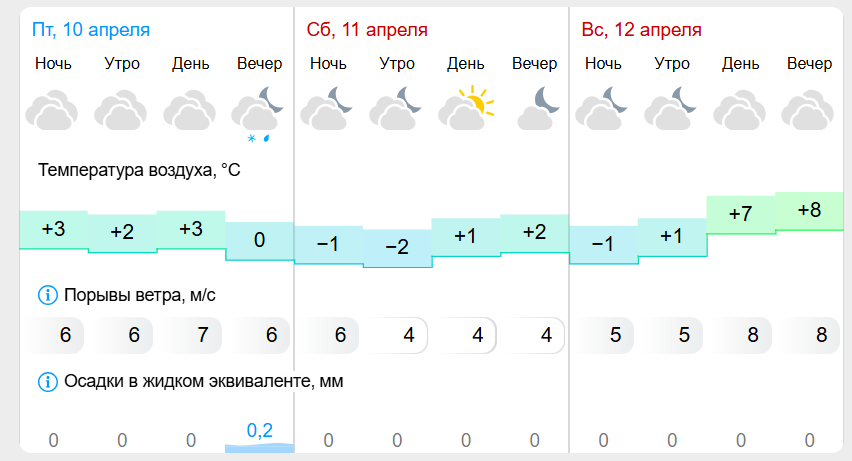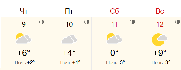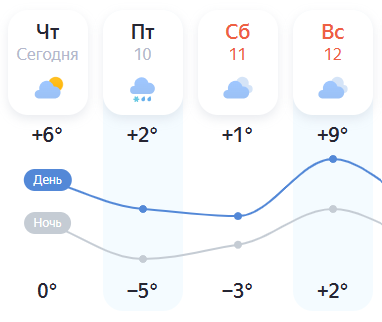 Яндекс.Погода прогнозирует дождливую и прохладную пятницу с температурой +2°C. В субботу потепления не предвидится — всего +1°C. Хотя в воскресенье воздух прогреется до +9°C, день будет сырым и снежным.